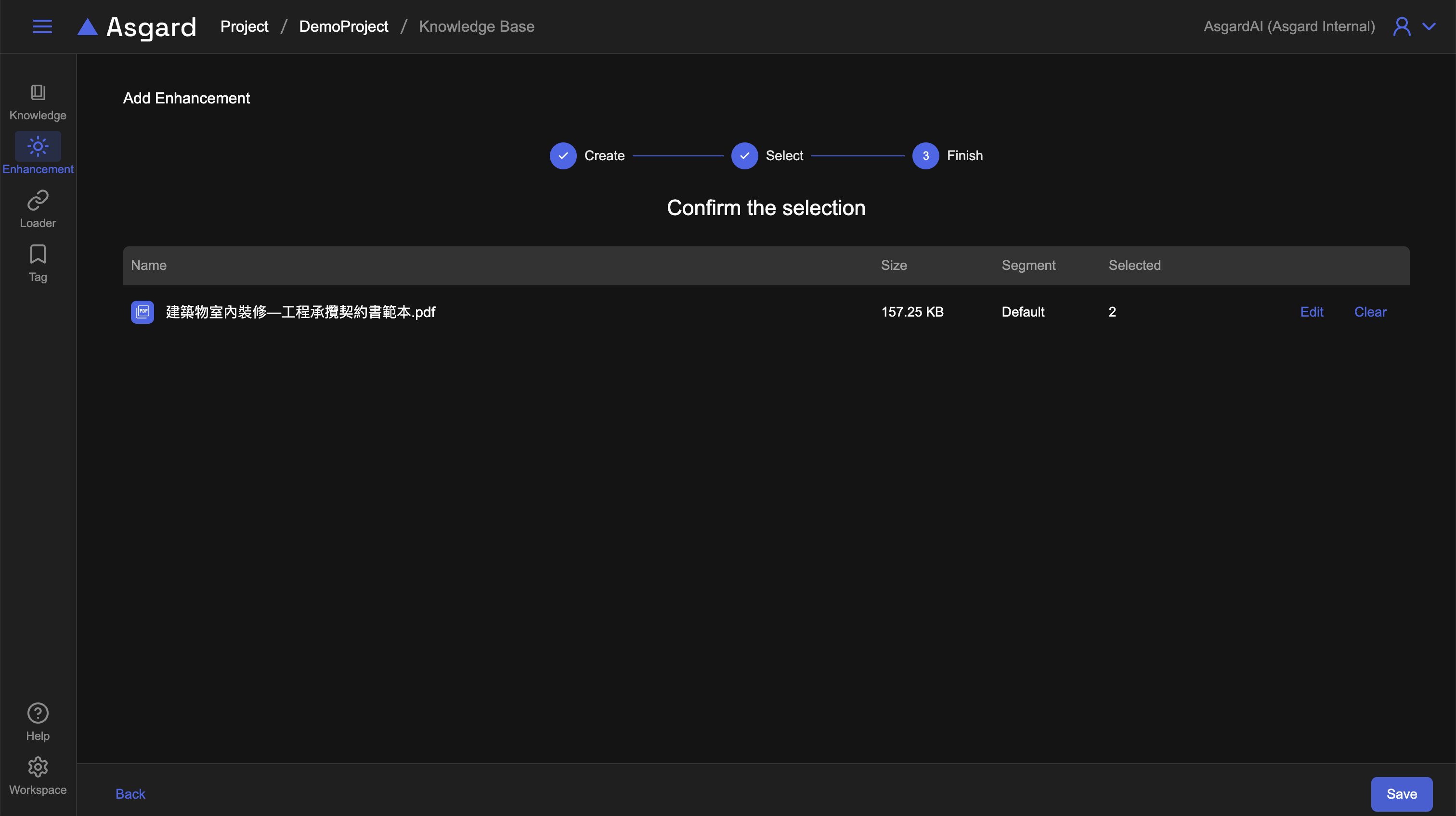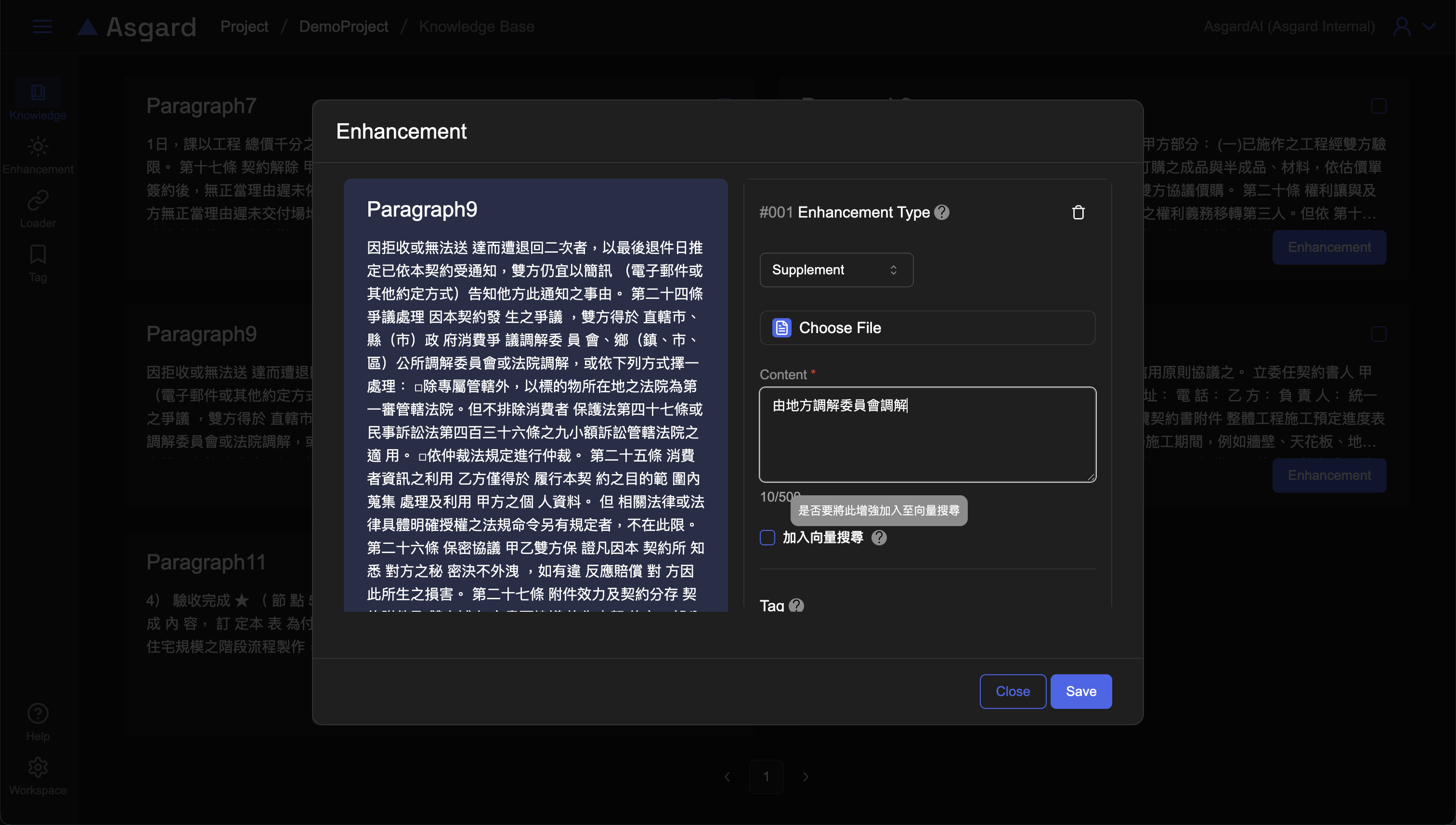 針對該 Enhancement 可以上傳檔案(選填)作為補充資料與說明;可以勾選是否要將該增強加入向量搜尋。