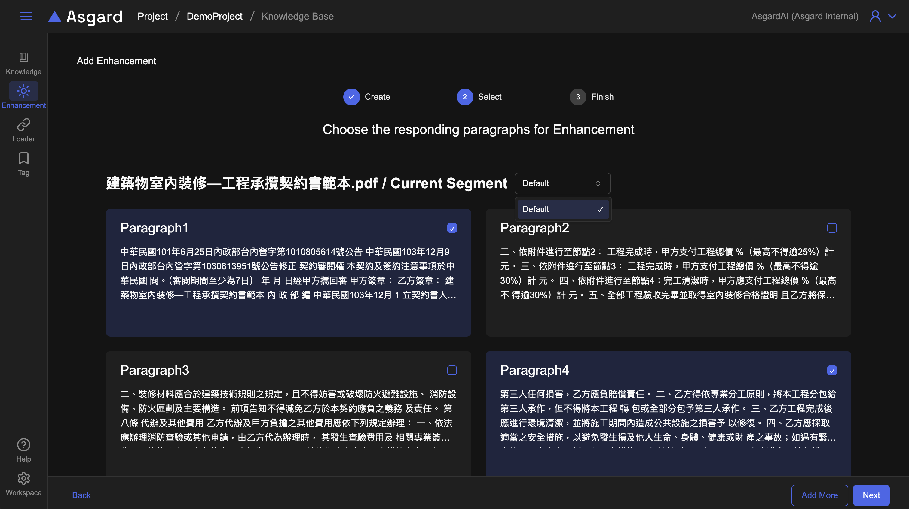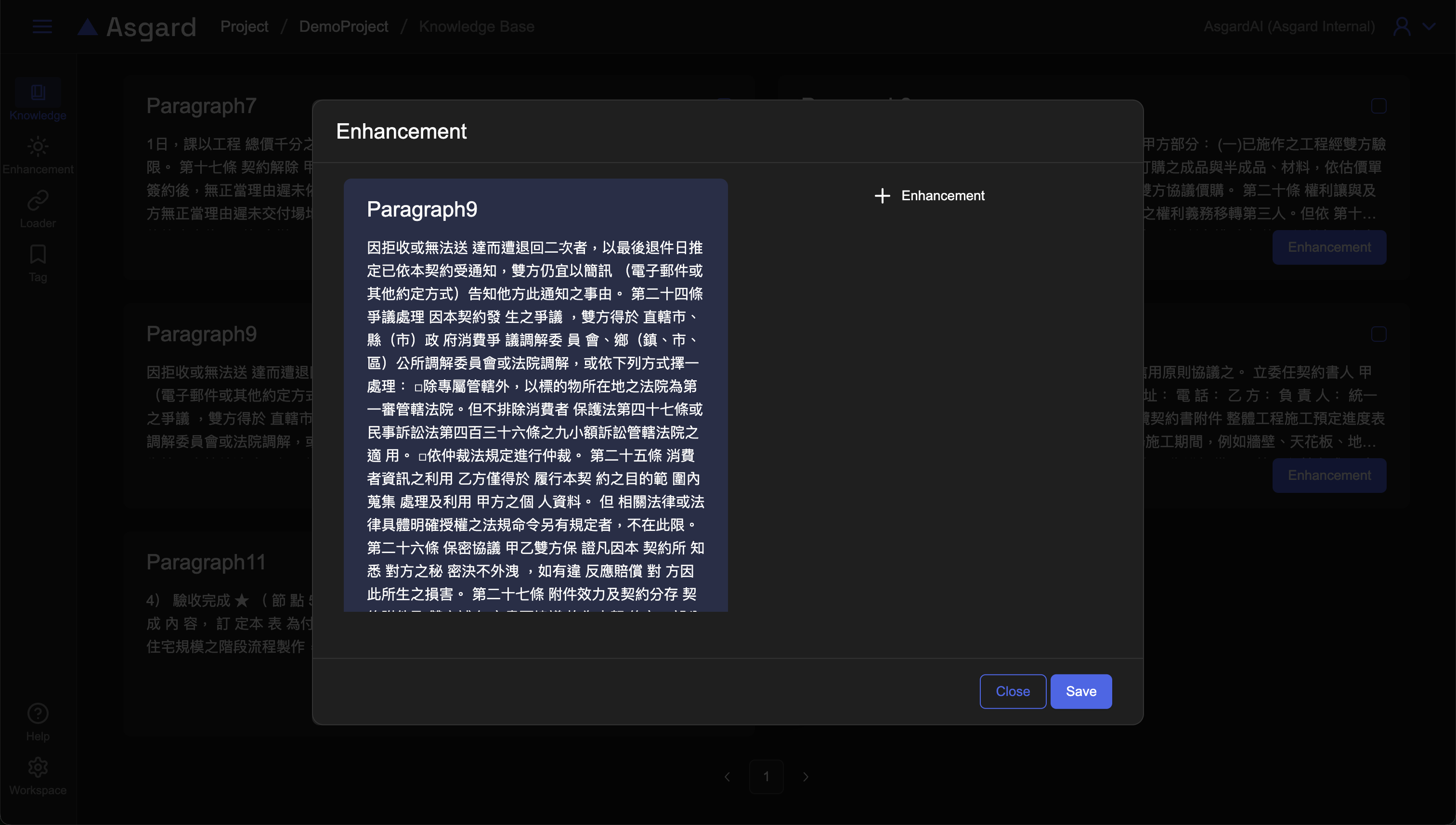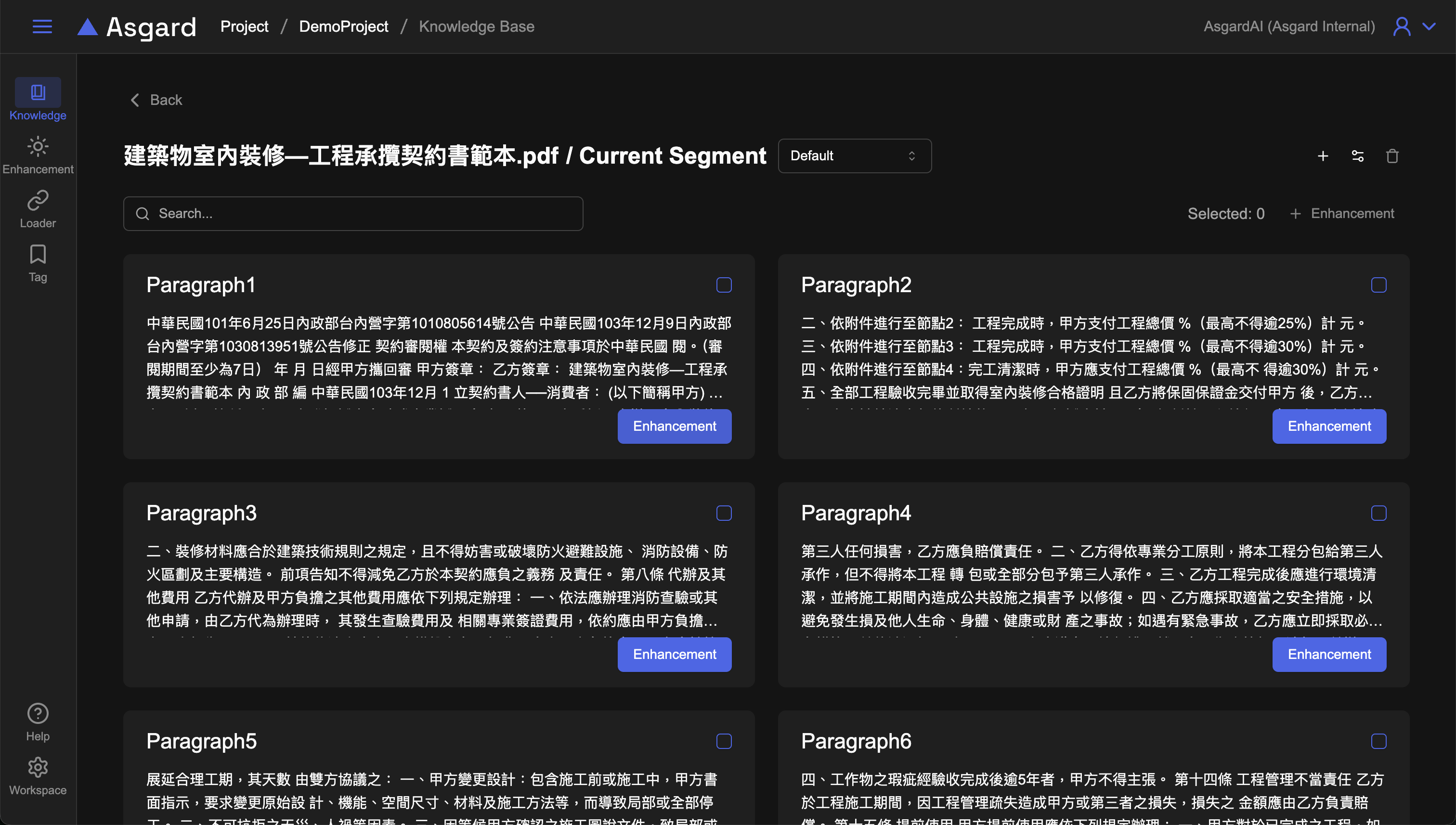 在基本的 RAG 功能之上,您可以隨心所欲地在檔案分段裡添加增強(Enhancement)以促進 AI 理解的程度。您可以在檢視檔案分段時新增 Enhancement 或是統一在 Enhancement 管理頁面新增。