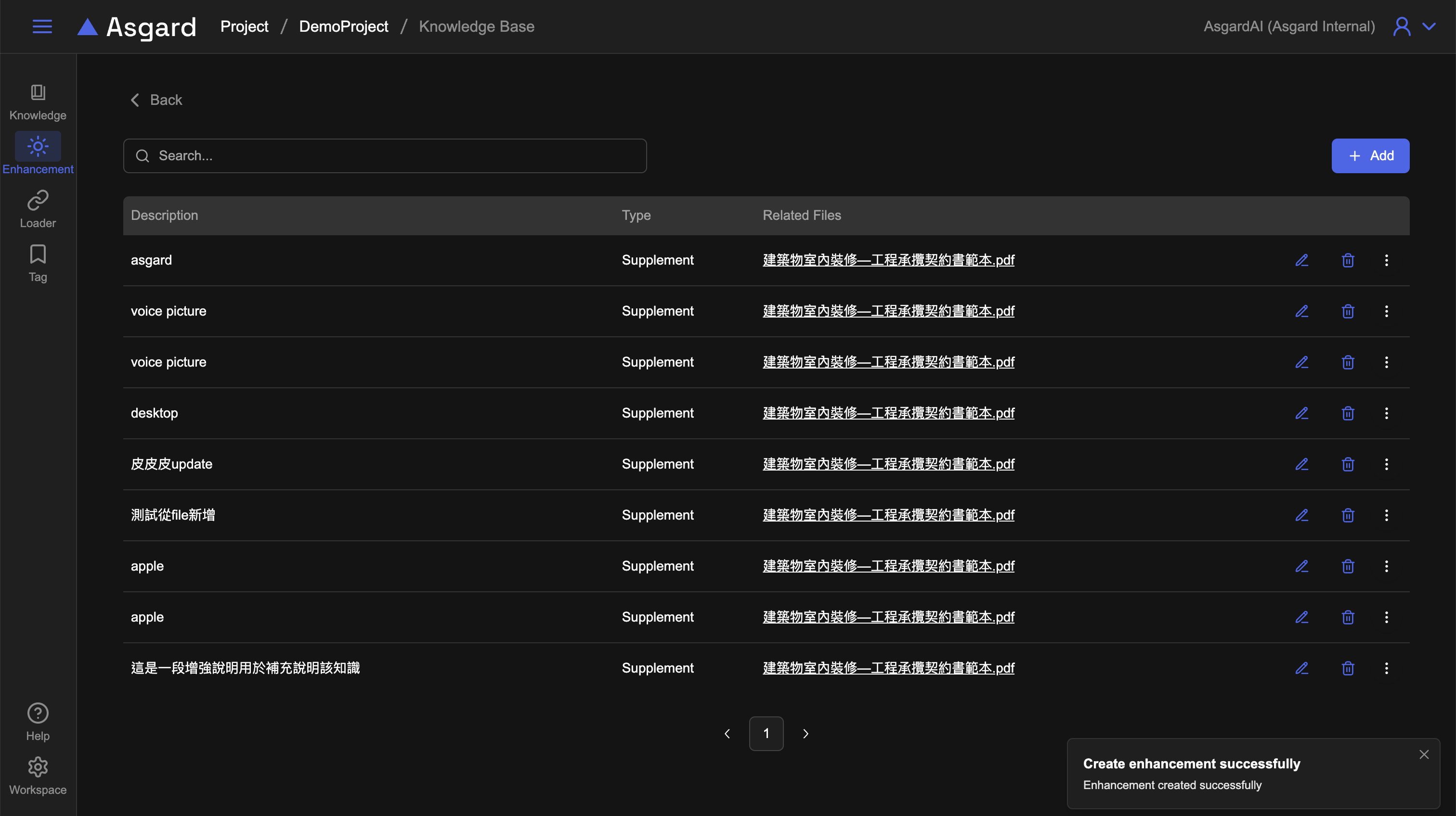 由知識庫內的 Enhancement 管理頁面可以檢視目前已經新增的所有 Enhancement。此處可以搜尋、編輯、刪除或新增 Enhancement。