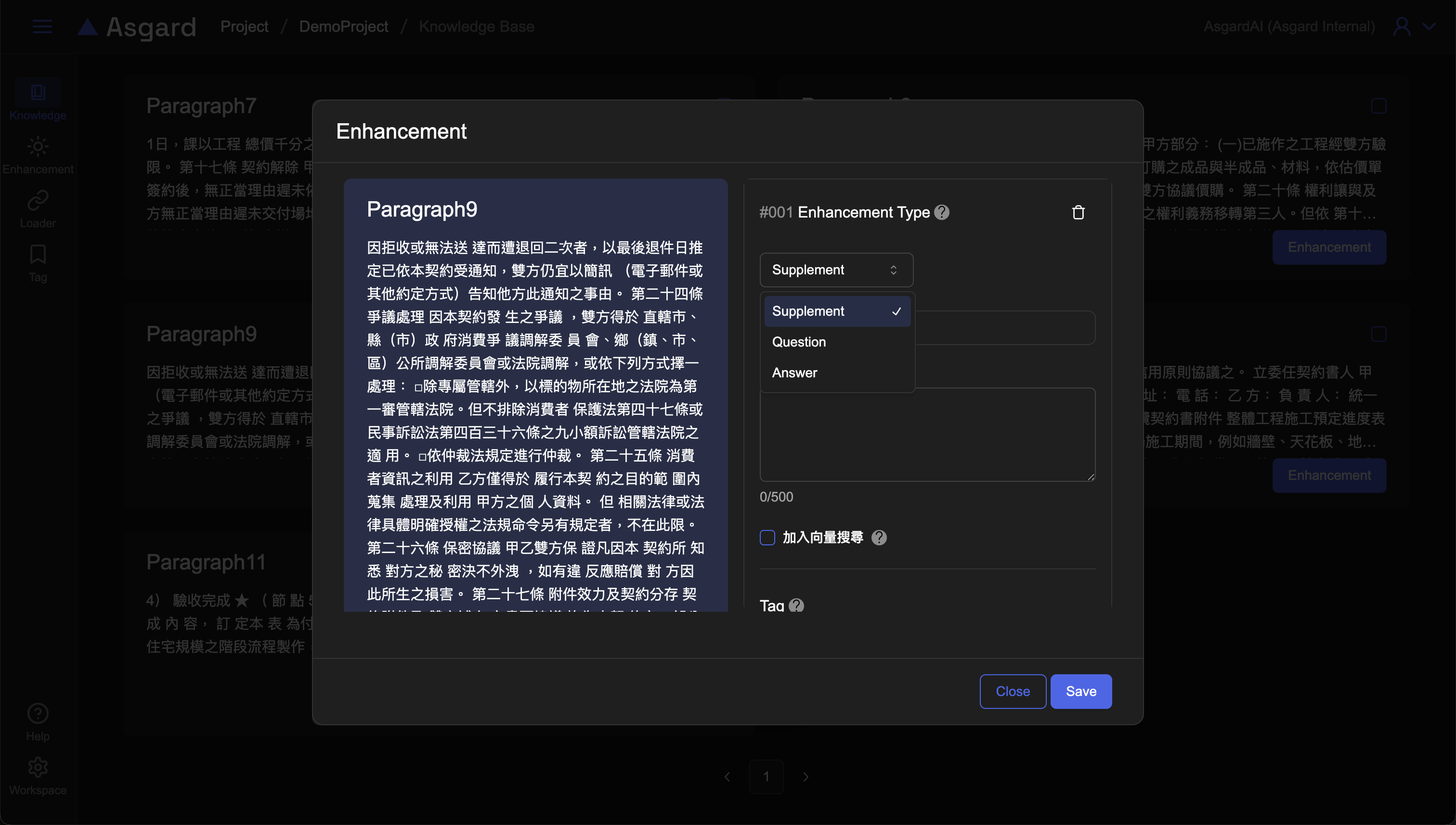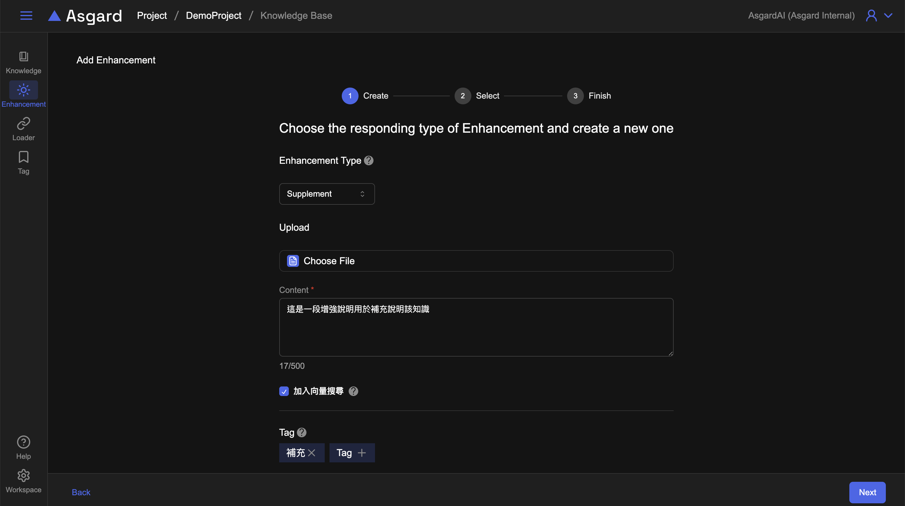 點擊右上角的「+ Add」進入新增 Enhancement 設定,此處設定與由檔案內新增相同,有三種增強類型可以選擇:補充內容(Supplement)、問題(Question)、答案(Answer)。在填寫增強時,可以上傳檔案作為補充資料(選填);可以勾選是否要將該增強加入向量搜尋。