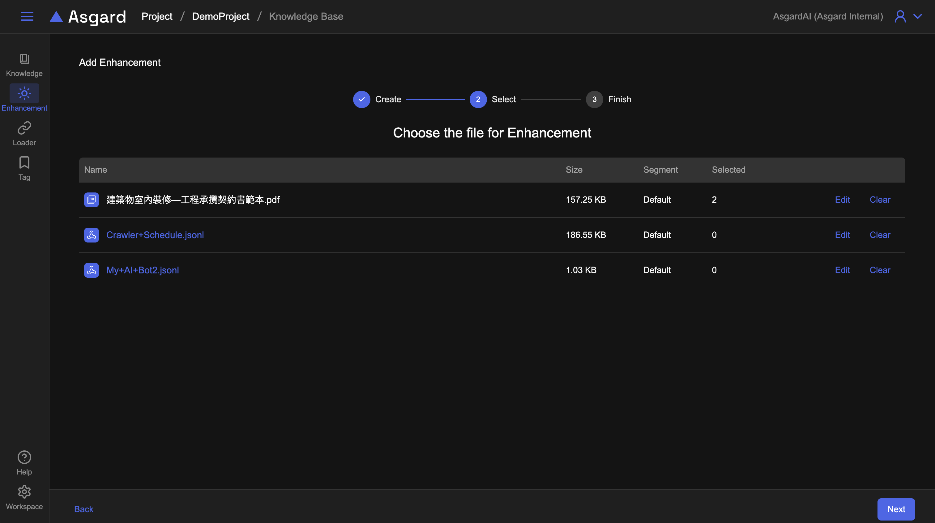 點擊「Add More」可以繼續選擇檔案並勾選,選擇「Next」可以檢視目前新增的概況,下圖為點擊「Add More」的示意圖,會回到檔案清單,此時可以看到剛剛針對了第一個檔案有選擇了 2 個分段要添加 Enhancement。可以繼續編輯或是清除目前勾選的分段。