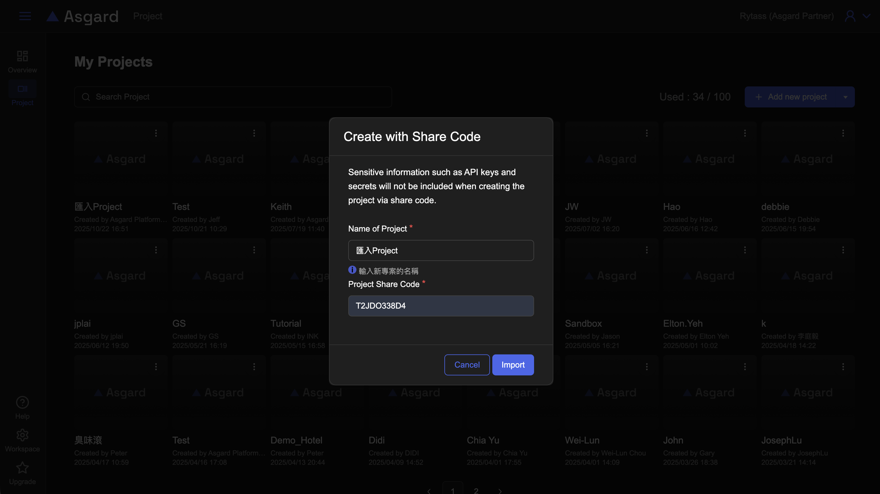 在新增 Project 的按鈕,您可以點擊選單選擇「Create with Share Code」輸入專案名稱以及 Share Code 後點擊 Import 即可。