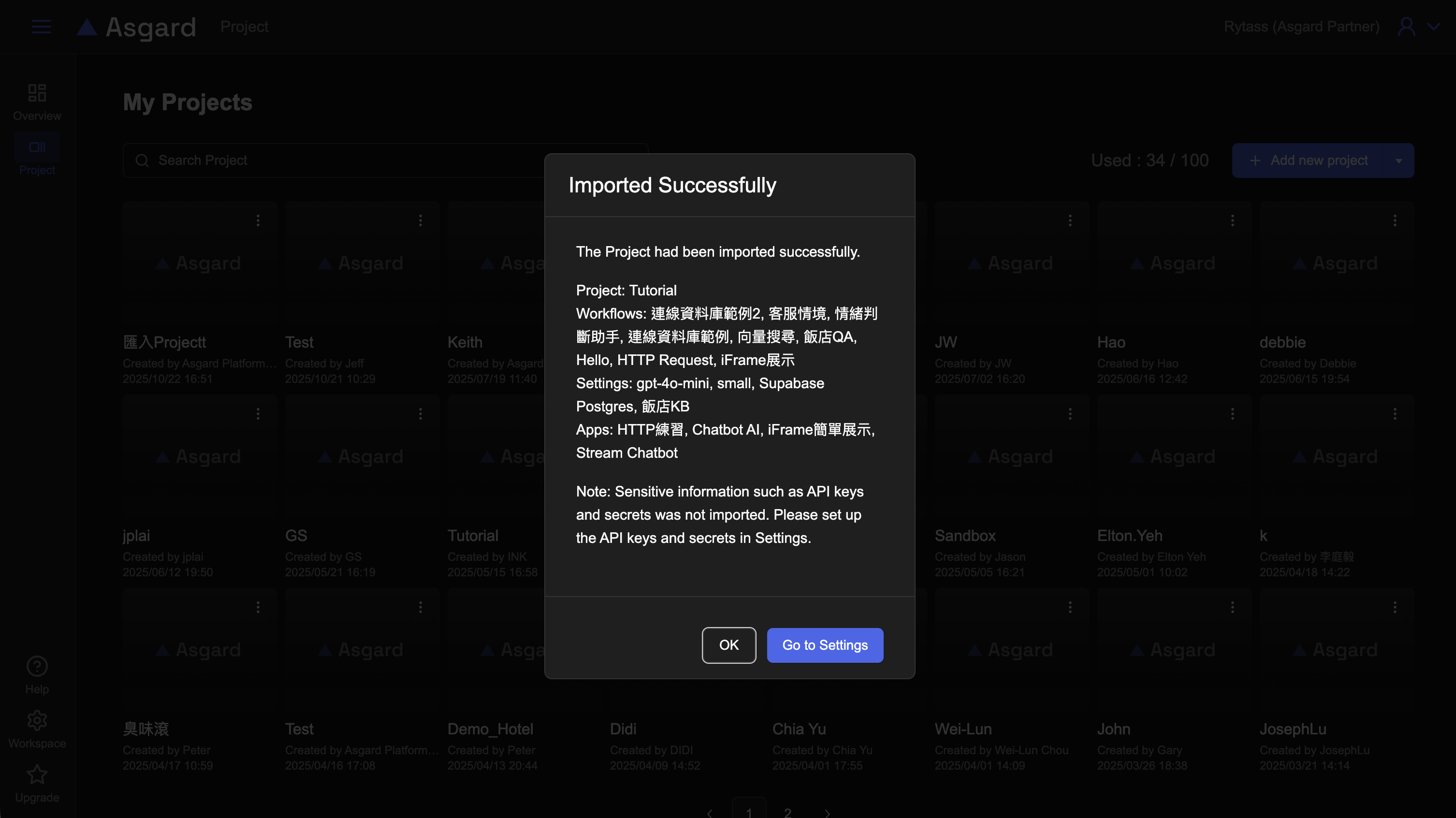 匯入完成後,可以檢視匯入的項目包含來源 Project、來源 Workflow、來源 Settings 以及來源 Apps 應用。由於分享並不會將 API Key 分享出去,因此需要手動填入,此處可以點擊「Go to Settings」並補填 API Key。
